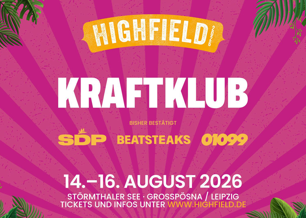 Perfektes Timing: Rund einen Monat vor ihrem Album-Release wurden Kraftklub Highfield Festival für das kommende Jahr bestätigt. Die Chemnitzer Band stößt damit zu weiteren Top-Acts. Hierzu zählen SDP, Beatsteaks und 01099. Das Festival findet vom 14. bis 16. August 2026 statt. Außerdem liegt es am Störmthaler See vor den Toren Leipzigs.