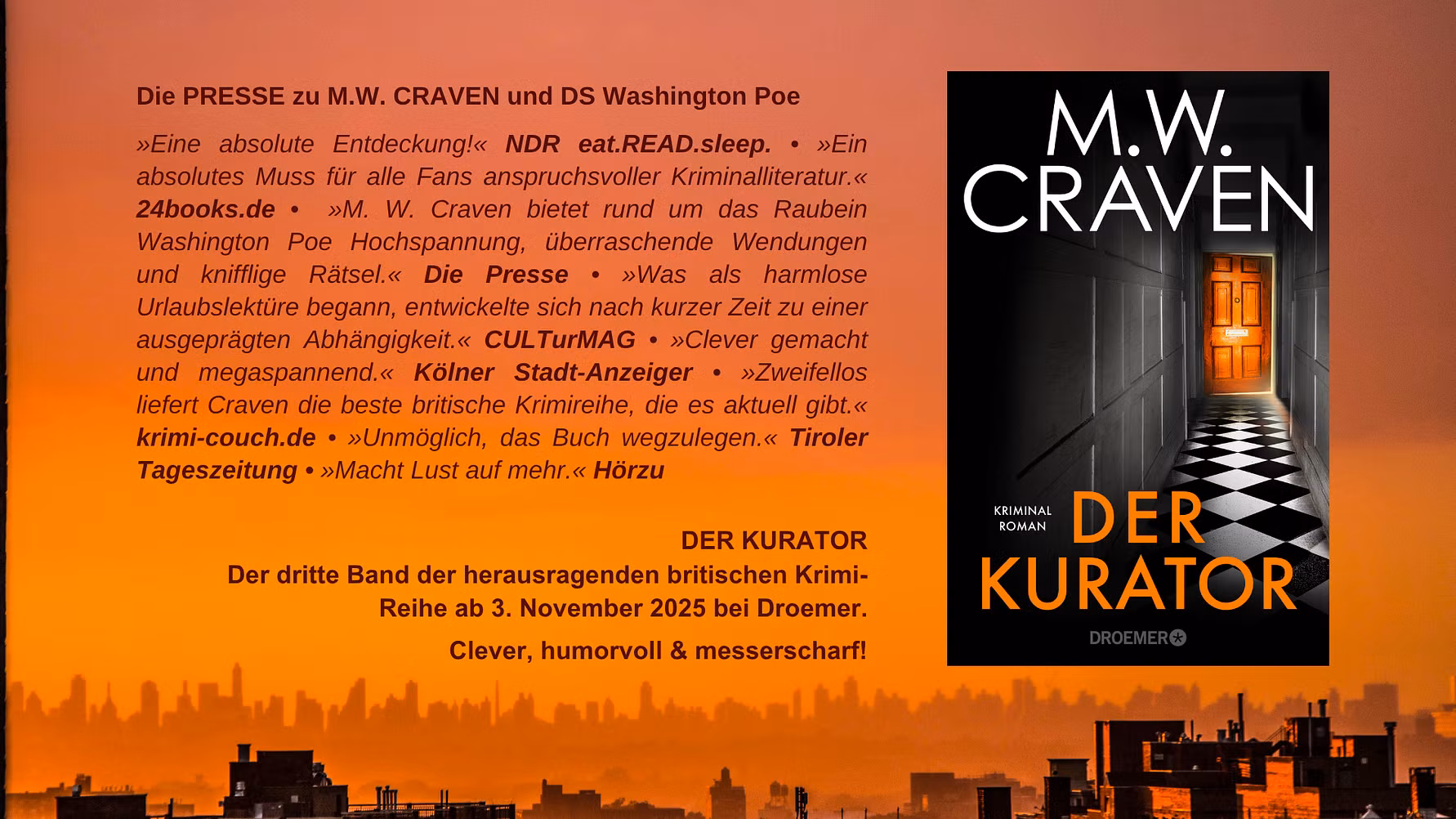 Der neue Band M.W. Craven DER KURATOR entführt Fans der preisgekrönten DS Washington Poe Reihe erneut nach Cumbria. Mit packender Hochspannung, pointiertem britischem Wortwitz und unerwarteten Wendungen zeigt Craven erneut, warum seine Thriller international gefeiert werden.