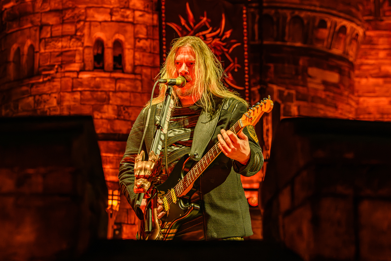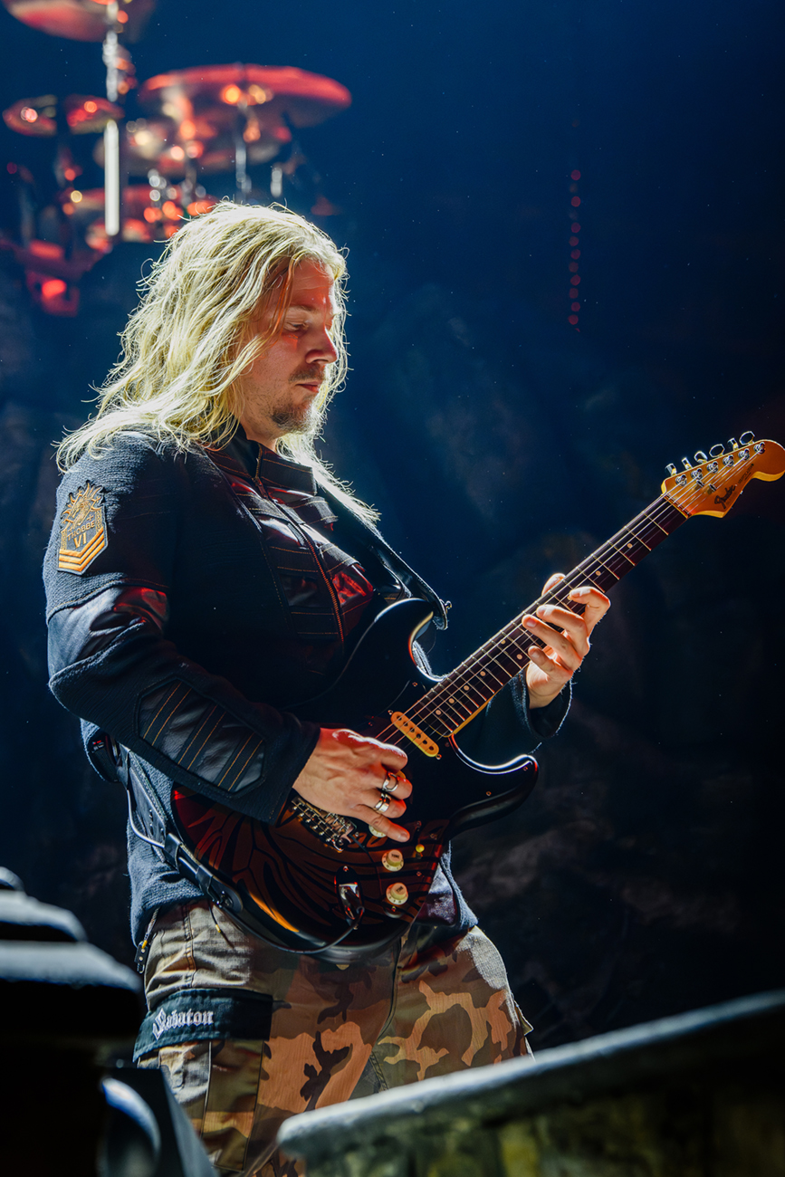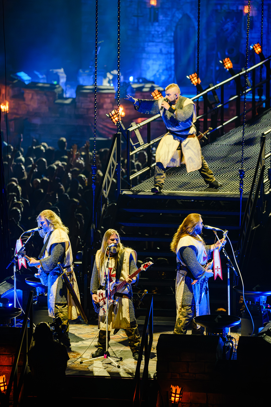 Die Burg-Kulisse war monumental und erzeugte sofort eine mittelalterliche, epische Atmosphäre. In der Mitte der Burg, wo normalerweise der Eingang vermutet werden würde, thronte der Drummer. Diese zentrale Position unterstrich die Bedeutung des Rhythmus in den martialischen Hymnen. Frontmann Joakim Brodén, in seiner ikonischen Panzerweste, führte die ausverkaufte Arena durch eine Setlist voller Premieren und Fan-Favoriten. Die Sabaton Lanxess Arena Köln war von der ersten Sekunde an gefesselt.