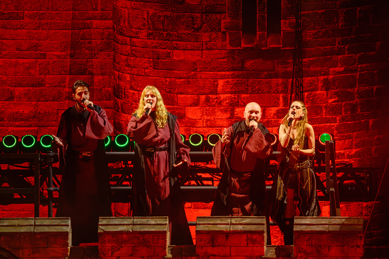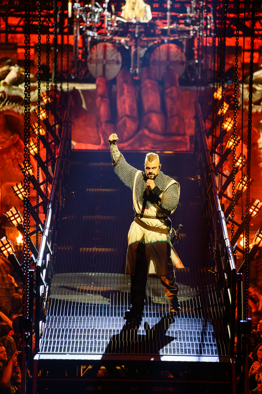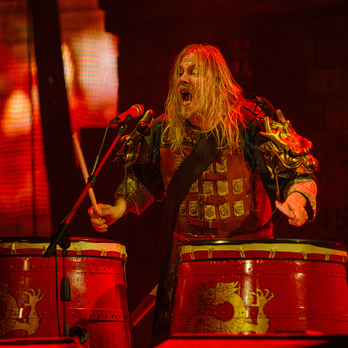 Die Burg-Kulisse war monumental und erzeugte sofort eine mittelalterliche, epische Atmosphäre. In der Mitte der Burg, wo normalerweise der Eingang vermutet werden würde, thronte der Drummer. Diese zentrale Position unterstrich die Bedeutung des Rhythmus in den martialischen Hymnen. Frontmann Joakim Brodén, in seiner ikonischen Panzerweste, führte die ausverkaufte Arena durch eine Setlist voller Premieren und Fan-Favoriten. Die Sabaton Lanxess Arena Köln war von der ersten Sekunde an gefesselt.