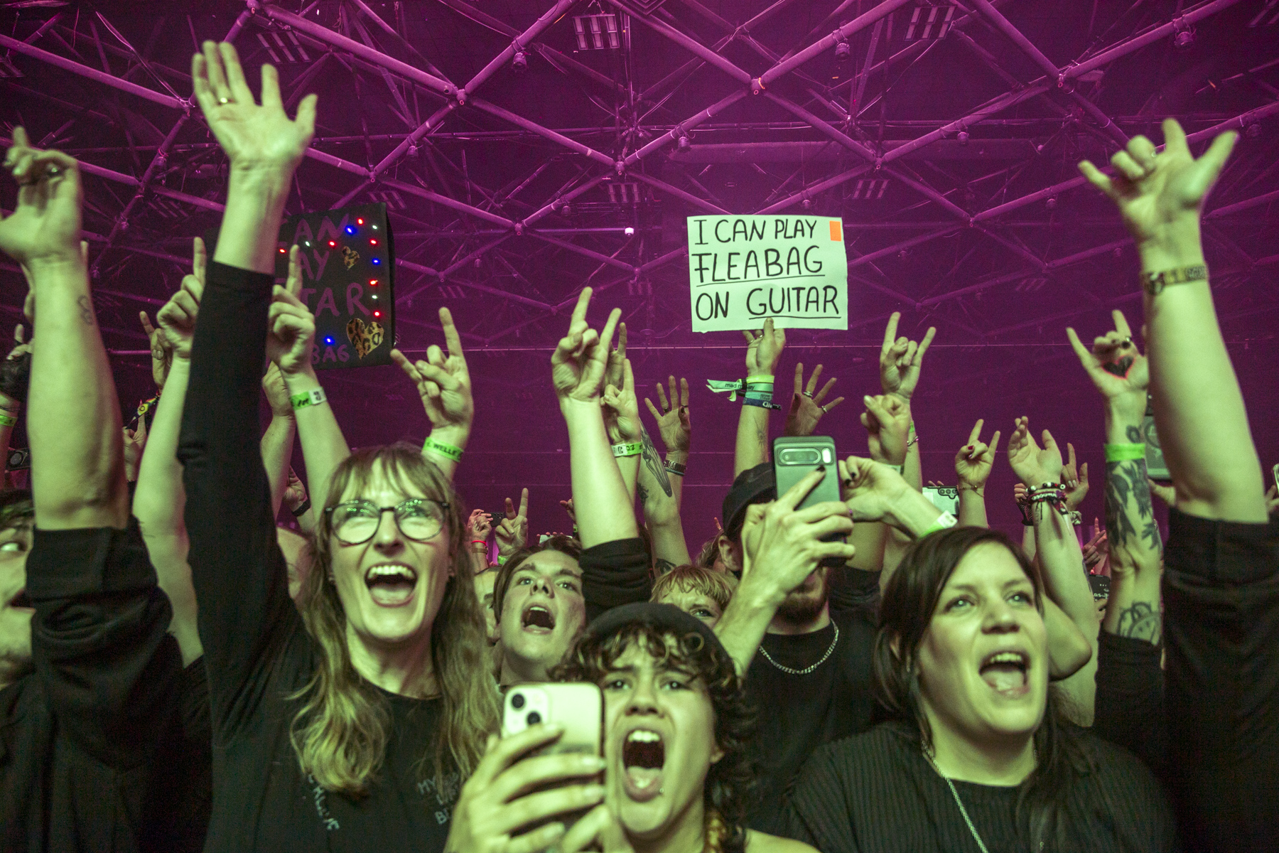 Ein fester Bestandteil seiner aktuellen Idols Tour ist der Moment, in dem ein Fan auf die Bühne darf, um bei „fleabag“ Gitarre zu spielen. Auch in Düsseldorf ist die Aufregung groß – zahlreiche Schilder gehen in die Höhe. Yungblud lacht, wählt jemanden aus der Menge, scherzt: „Don’t lie to me – can you really play?“ – und dann wird’s wild. Die Halle tobt, die Gitarre kreischt, und wieder zeigt sich, warum dieser Musiker sein Publikum so liebt: weil er sie mit einbezieht, weil er sie braucht.